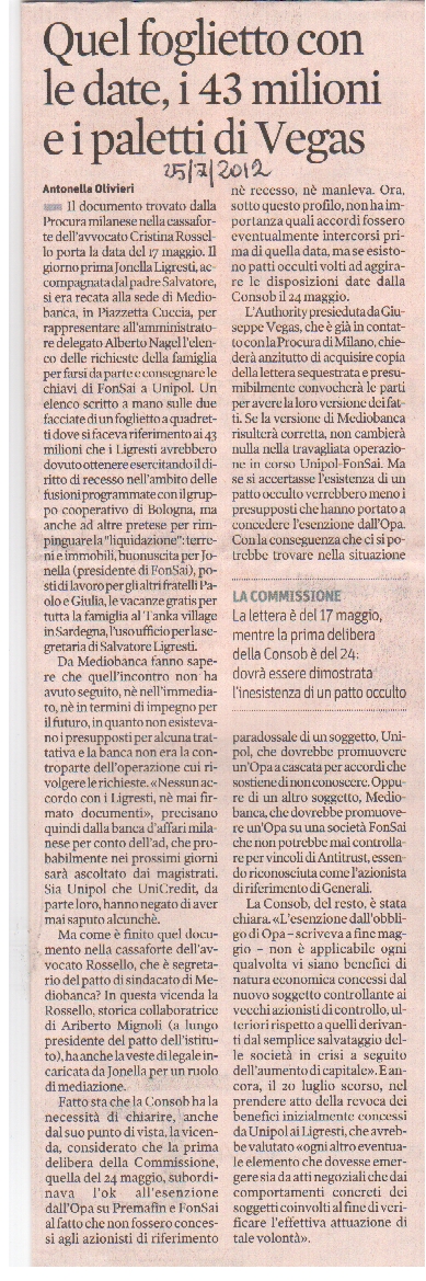 Nella paginata, un secondo articolo (vedi….) a firma di Antonella Olivieri, dal titolo “Quel foglietto con le date, i 43 milioni e i paletti di Vegas” rivela che “il documento trovato dalla Procura milanese nella cassaforte dell’avvocato Cristina Rossello porta la data del 17 maggio….Un elenco scritto a mano…dove si faceva riferimento ai 43 milioni che i Ligresti avrebbero dovuto ottenere….ma anche altre pretese per rimpinguare la ‘liquidazioni’: terreni ed immobili, buonuscita per Jonella Ligresti (presidente di Fonsa), posti di lavoro per gli altri fratelli Paolo e Giulia, le vacanze gratis per tutta la famiglia al Tanka village in Sardegna, l’uso ufficio per la segretaria di Salvatore Ligresti....”