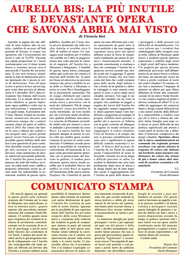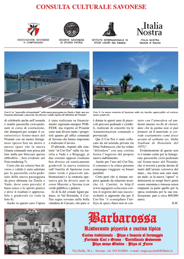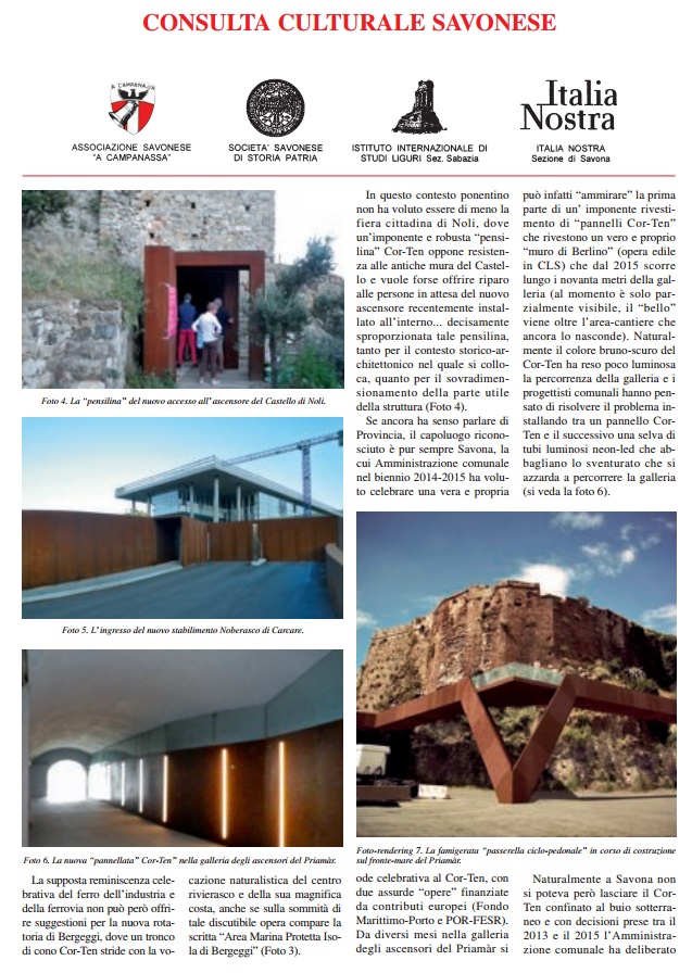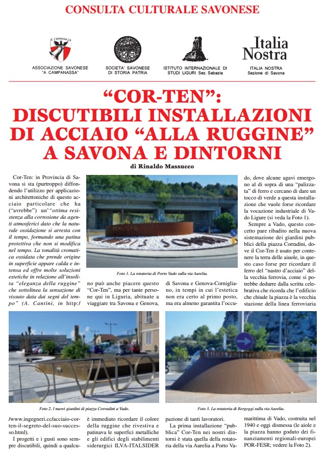L’ultimo numero, fresco di stampa, de A Campanassa riporta due servizi che meritano la lettura e l’approfondimento. Il primo a firma di Rinaldo Massucco: “Cor- Ten. Discutibili installazioni di acciaio ‘ alla ruggine’ a Savona e dintorni”. In Valbormida regna sovrano, persino nella nuovissima azienda Noberasco, a Vado, Bergeggi, Spotorno, Noli. Con quale motivazione e cosa nasconde ? Il secondo articolo è firmato da Vittorio Siri. Significativo e solare il titolo: ” Aurelia – bis. La più inutile e destante opera che Savona abbia mai visto”. Interessante, inoltre, la riflessione di Massimo Iacono: ” La viabilità di Villapiana. Luci e Ombre ” (pag. 12)