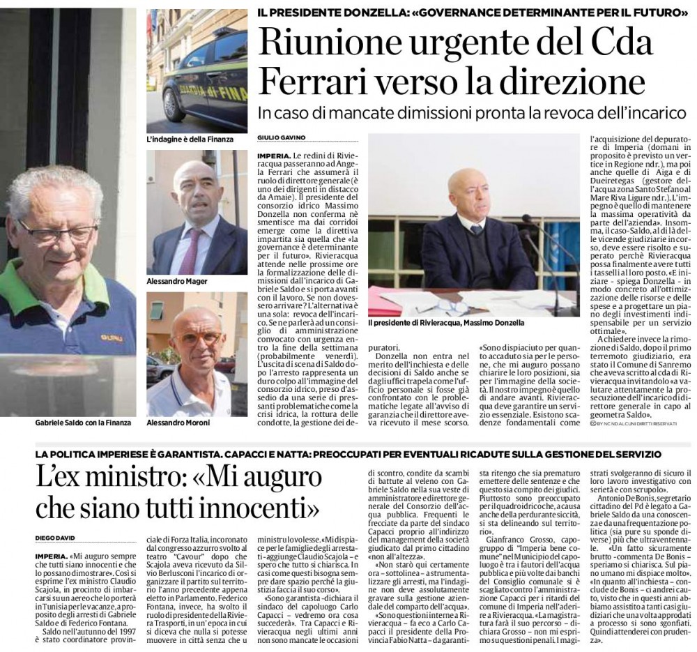 Gabriele Saldo che, secondo l’accusa, è scivolato per aiutare un candidato ad un concorso della società pubblica Spa Rivieracqua che proprio in questi giorni è salita alla ribalta per i casi di inquinamento marino ad Andora e Diano Marina e la minaccia del sindaco forzista Demichelis di chiedere i danni di immagine, in pena stagione balneare. Rivieriacqua, col suo fresco presidente avv. Massimo Donzella, novello sposo, al centro di accuse anche sul fronte dei rifornimenti in alcune località rimaste con i rubinetti asciutti.