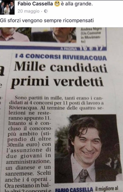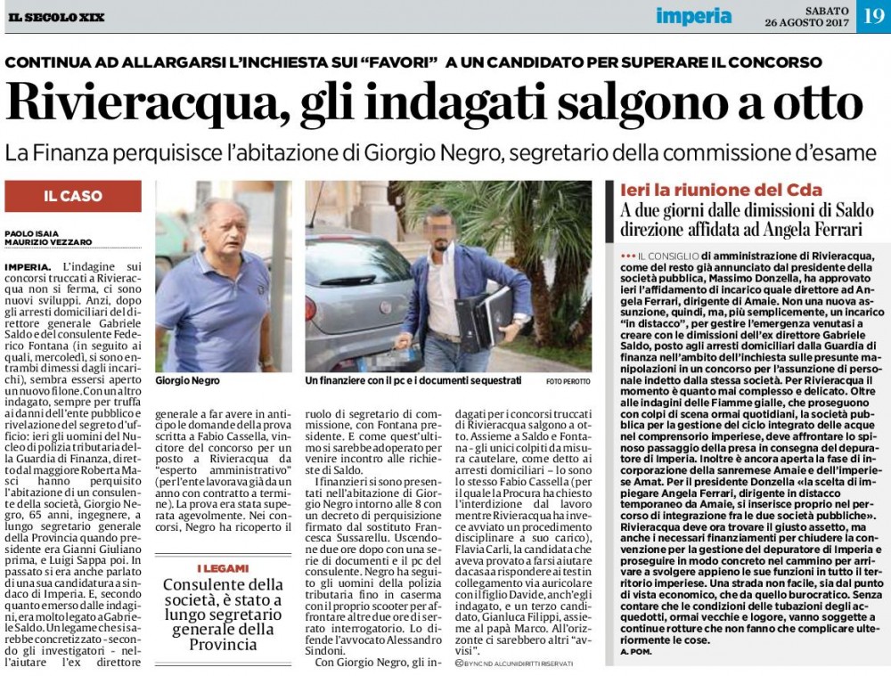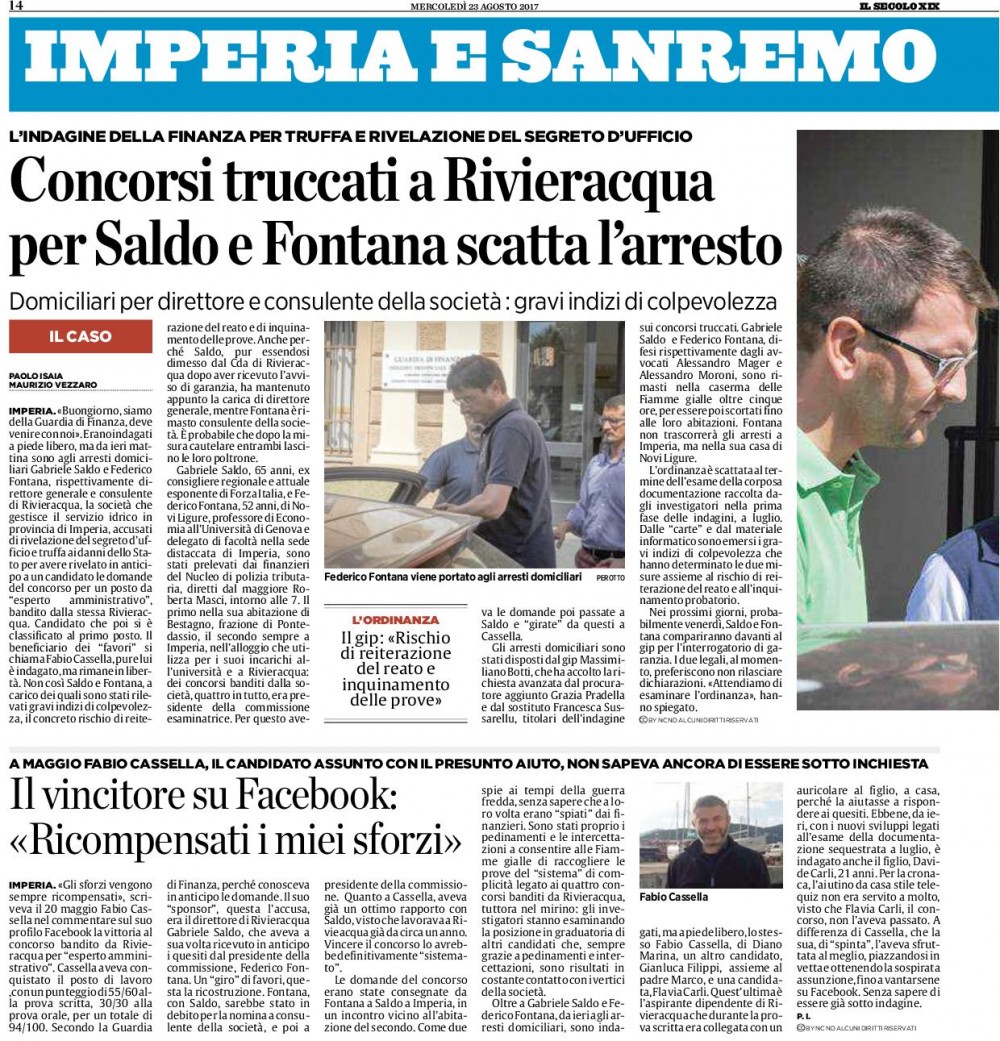 Era maggio e Fabio Casella ‘postava’ su Facebook la soddisfazione di aver vinto il concorso con tanto di scritta: “Gli sforzi vengono sempre ricompensati”. A corredo dell’articolo su Stampa e Secolo XIX  che davano notizia dei primi verdetti, tra i mille candidati, che aspiravano ad un impiego a Rivieracqua. Ora gli arresti, gli imputati detenuti a domicilio che si avvalgono della facoltà di non rispondere al primo interrogatorio davanti al Gip, il presidente del tribunale Eduardo Bracco. La richiesta di sospensione dal servizio dello stesso ‘beneficiato’ Casella. I due arrestati si sono dimessi dai rispettivi incarichi nella Spa pubblica. Ma dopo qualche decennio di ‘vita e informazione giudiziaria’ siamo tra gli ultimi ad avere certezze di colpevolezza. Certo l’arresto di Gabriele Saldo, 65 anni, tra i personaggi politici imperiesi più popolari nel ponente ligure per il suo ruolo di capogruppo (ex) in Regione,  ormai ex direttore generale del Consorzio idrico Rivieracqua e del prof. Federico Fontana, docente universitario a Genova, delegato della Facoltà di Economia al polo universitario imperiese, non può  lasciare indifferenti  neppure i savonesi e nel Basso Piemonte.  Il primo ha molti amici ed estimatori, conoscenti, oltre i confini della sua provincia e si è occupato di tematiche di comune interesse, come la salvaguardia dell’ospedale di Albenga. Il secondo che è nato  e vive a Novi Ligure dove ha scelto gli arresti domiciliari, ma pure noto a Palazzo Sisto a Savona e a Palazzo Doria, a Loano dove i dipendenti comunali lo ricordano in ‘cattedra’ a tenere corsi di anticorruzione. Oltre a vice direttore del Centro Studi e Ricerche sulle Autonomie Locali di Savona. Ultima ora coinvolto e perquisito la casa dell’ing. Giorgio Negro,65 anni. ex segretario generale della Provincia con i presidenti Giuliano e Sappa.