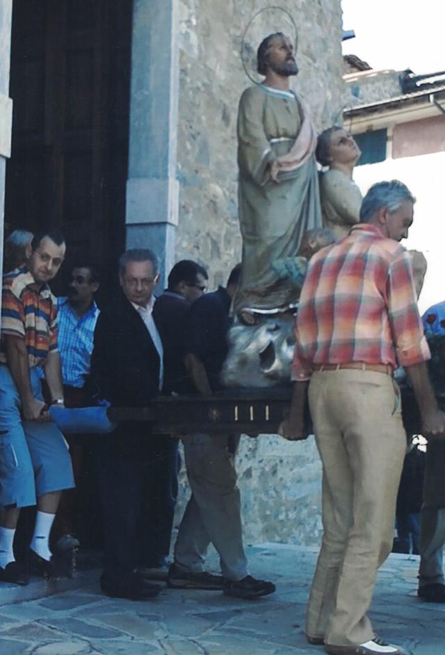 Gabriele Saldo, con gli occhiali, in processione a Mendatica porta la statua del Santo Patrono (foto archivio trucioli 1989)