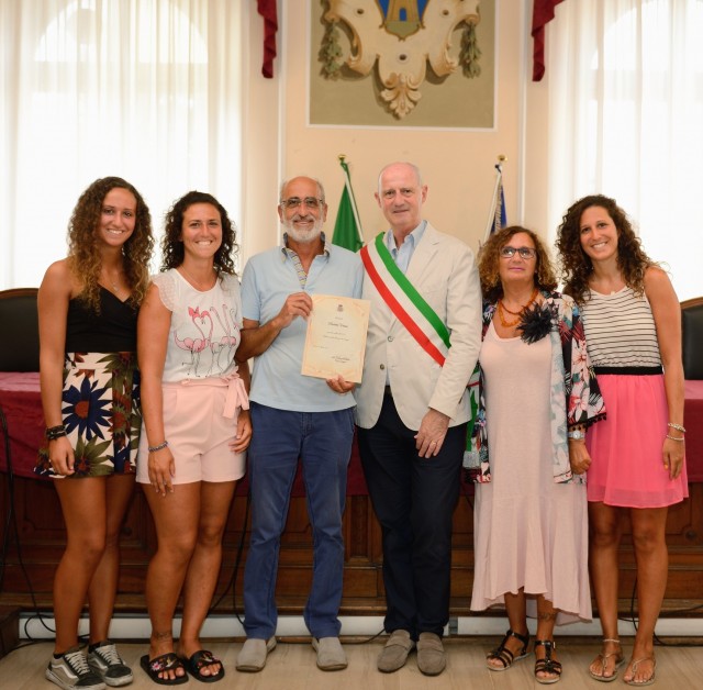 Il dr. Robero Vanini, turista fedele ad Alassio dal lontano 1953, ricevuto dal sindaco Canepa e accompagnato da moglie e figlie