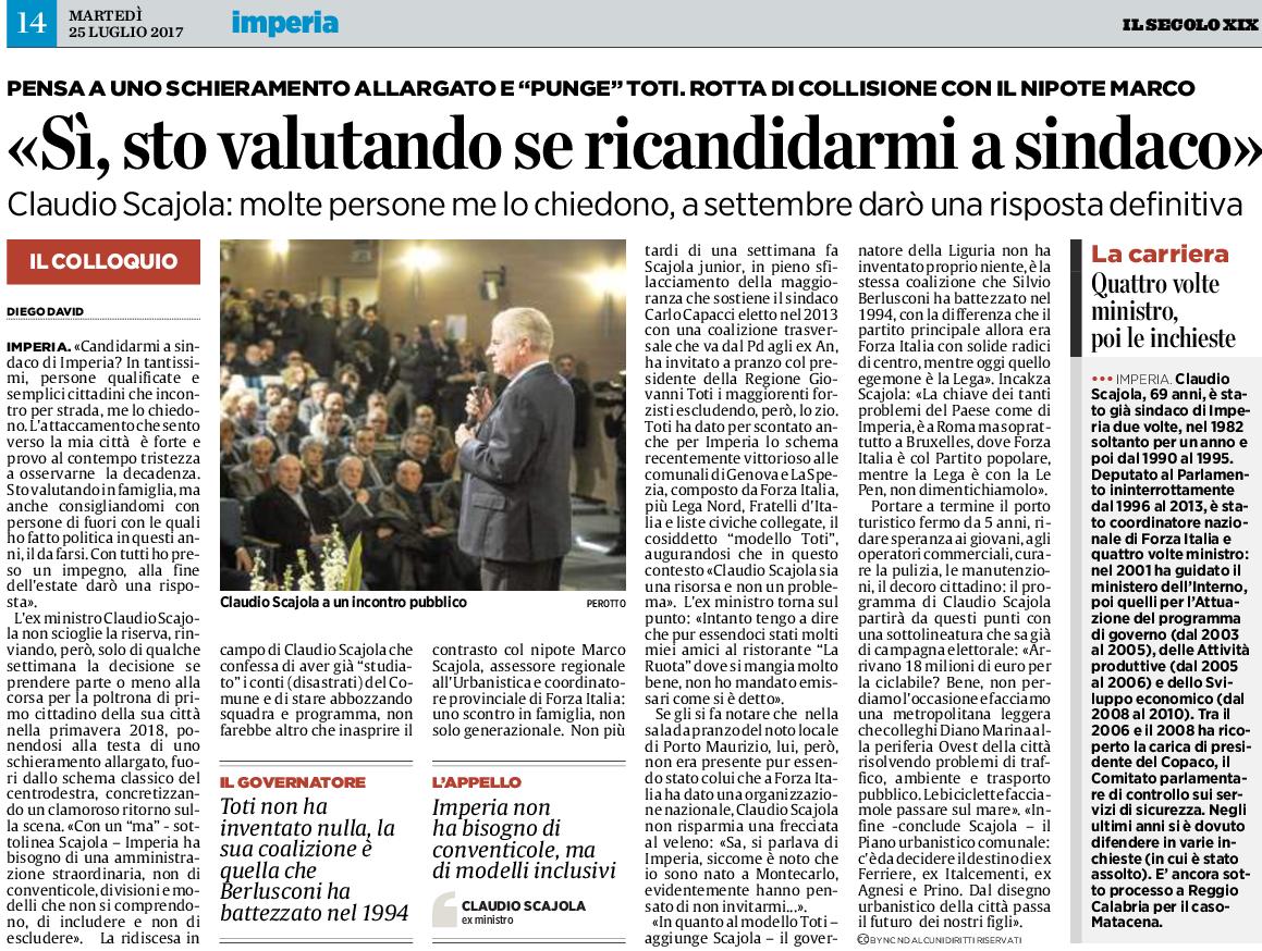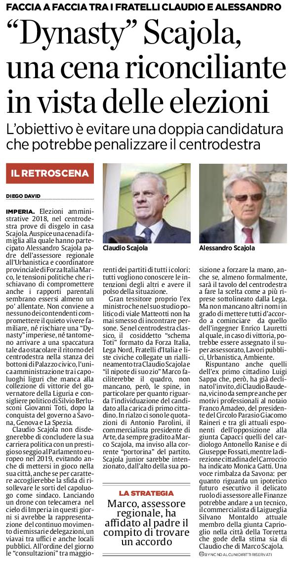 Un giorno titolano e leggiamo con sommo gaudio che zio Claudio sta pensando alla candidatura a sindaco di Imperia (un ritorno) per ‘rilanciare la città, la sua economia, i posti di lavoro per i giovani laureati e diplomati, una vecchiaia serena per gli anziani’. Il giorno dopo che Sciaboletta che pare abbia fatto pace, almeno giudiziaria con il nemico numero uno della Casa della Legalità (col versamento di mille euro a scopo benefico per diffamazione al presidente Cristian Abbondanza), starebbe facendo un pensierino al parlamento di Strasburgo, togliendo castagne dal fuoco all’ormai potente e riverito dal popolo, nipote Marco, pure lui grande amico di Monesi e tifoso del suo rilancio. Per via della nonna, quando lui era bambino. Soltanto che gli Scajola hanno venduto negli anni buoni e se ne sono andati da Monesi e i loro ammiratori, opportunamente tenuti a bada dai battaglieri leghisti di governo e di potere, non devono scoraggiarsi, sentirsi soli.