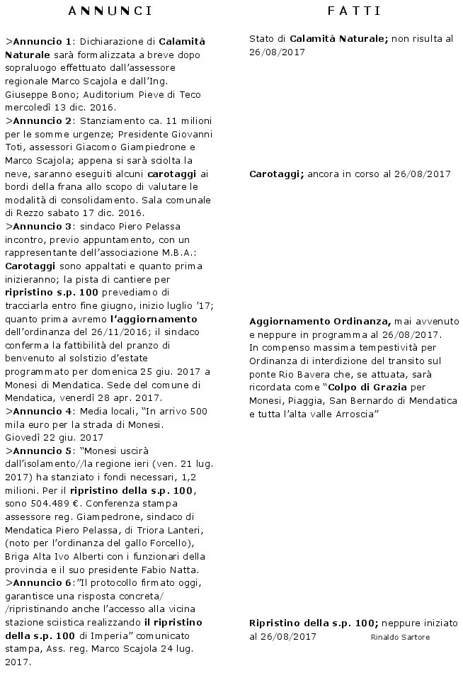 Egregio Presidente Giovanni Toti, Le trasmetto la sintesi degli annunci relativi a interventi volti a superare la drammatica situazione post frana a Monesi. Purtroppo ai molti annunci sono seguite pochissime azioni. Se sarà attuata la chiusura totale del transito sul ponte Rio Bavera, prima che sia realizzato il ripristino della s.p. 100, assisteremo ad un secondo disastro; questo certamente evitabile.