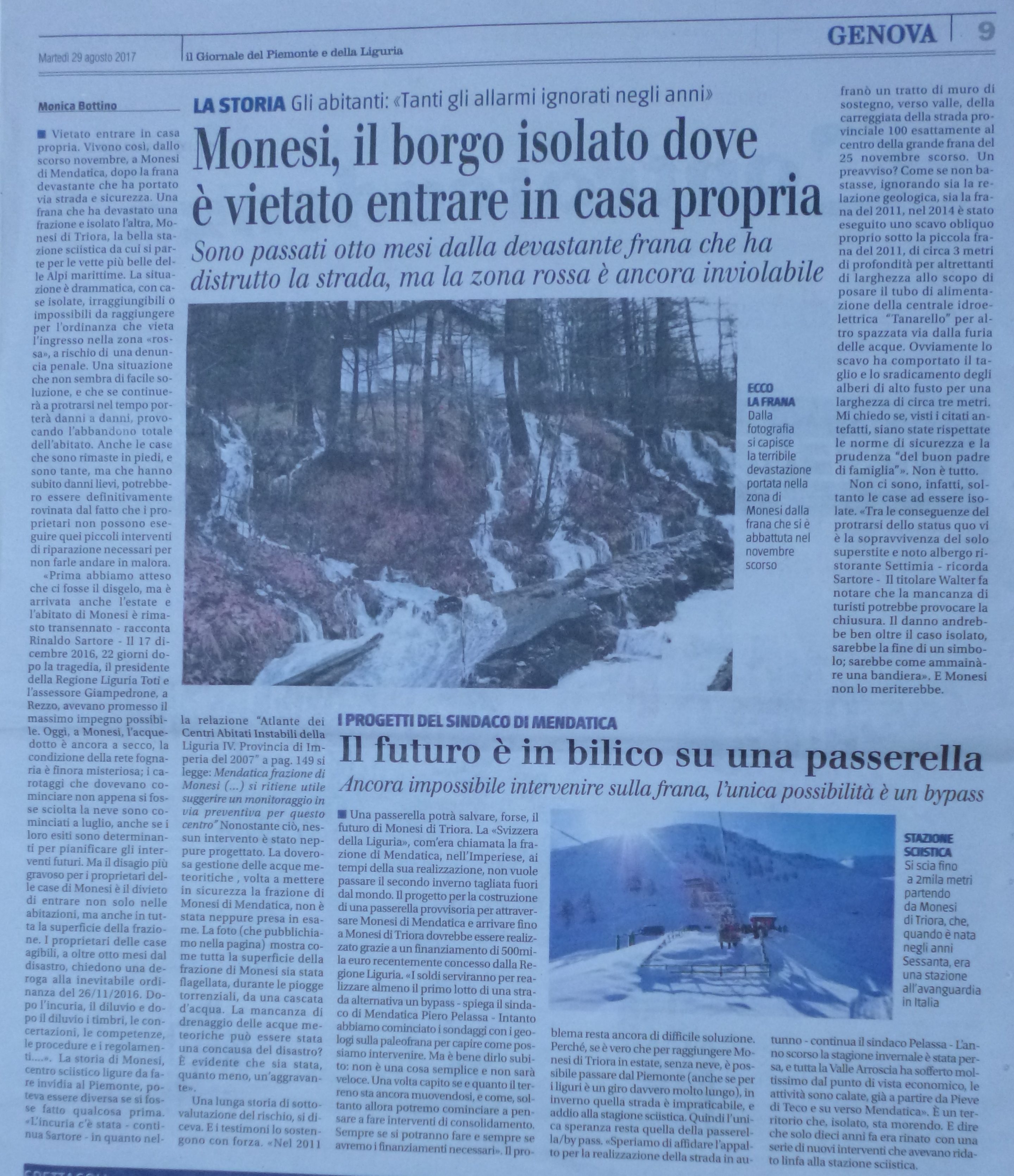 Provincia decisionista solo per chiudere le strade – “L’eventualità di veder chiusa, nei due sensi di marcia, la strada provinciale per Monesi e Piaggia a inizio della sempre più breve stagione estiva è un fatto inaudito”. Era il 21/6/2016 e il tratto che la polizia provinciale aveva deciso di chiudere, senza preavviso, era quello relativo ai lavori di consolidamento per piccola frana a circa metà strada tra San Bernardo e Monesi di Mendatica. In seguito alle lamentele e agli articoli prontamente apparsi sui giornali, gli stessi uffici provinciali scoprirono che si poteva ricorrere al senso unico alternato. Oggi dopo la catastrofe che ha messo in ginocchio Monesi e in serie difficoltà tutta l’economia della Valle Arroscia, la stessa provincia di Imperia ha condiviso, con la provincia di Cuneo, Regione Liguria e Piemonte, Sindaci di Mendatica e Triora, la decisione di chiudere la sola strada rimasta, vietando il traffico sul ponte Rio Bavera. Non discuto i pareri tecnici e la prudenza dei professionisti che hanno suggerito la chiusura totale del ponte, ma provo a mettere in discussione il buon senso; fino a fine giugno su quel ponte sono transitati autocarri fino a 7,5 t. poi il traffico è stato limitato agli automezzi fino alle 3,5 t. a pieno carico. Dal 5 settembre sul ponte non potrà più transitare neppure una bicicletta. Se il ponte sul Rio Bavera fosse a rischio crollo, la prudenza avrebbe imposto la chiusura immediata. Inoltre tutte le promesse sono, ad oggi, rimaste solo annunci, almeno quattro dei quali per lo stanziamento di 500.000 euro per tracciare la pista di cantiere atta a ricollegare la s.p. 100 nel tratto franato a Monesi di Mendatica. I lavori non sono ancora iniziati e l’autunno è alle porte; i carotaggi sono ancora in corso; L’ordinanza di inagibilità degli immobili di Monesi, impedisce a tutti i proprietari di entrare nelle loro case, anche in quelle palesemente intatte; chi ha avuto danni ai tetti non può procedere alle urgenti riparazioni; però in un battito di ciglia si è deciso, questo non è un annuncio, di chiudere l’unica speranza di salvezza per i pochi, eroici gestori delle superstiti attività turistiche del luogo. La comunicazione dell’ordinanza ai residenti e ai proprietari di seconde case dovrebbero darla, di persona e sul posto, gli stessi amministratori regionali che hanno dato speranze e formulando precise promesse. Se venissero saremmo in molti ad accoglierli. Sanremo 25/08/2017 Rinaldo Sartore