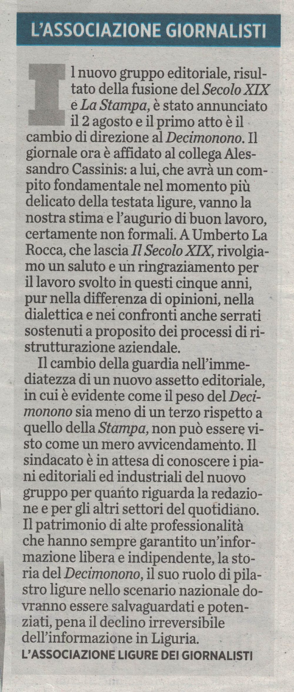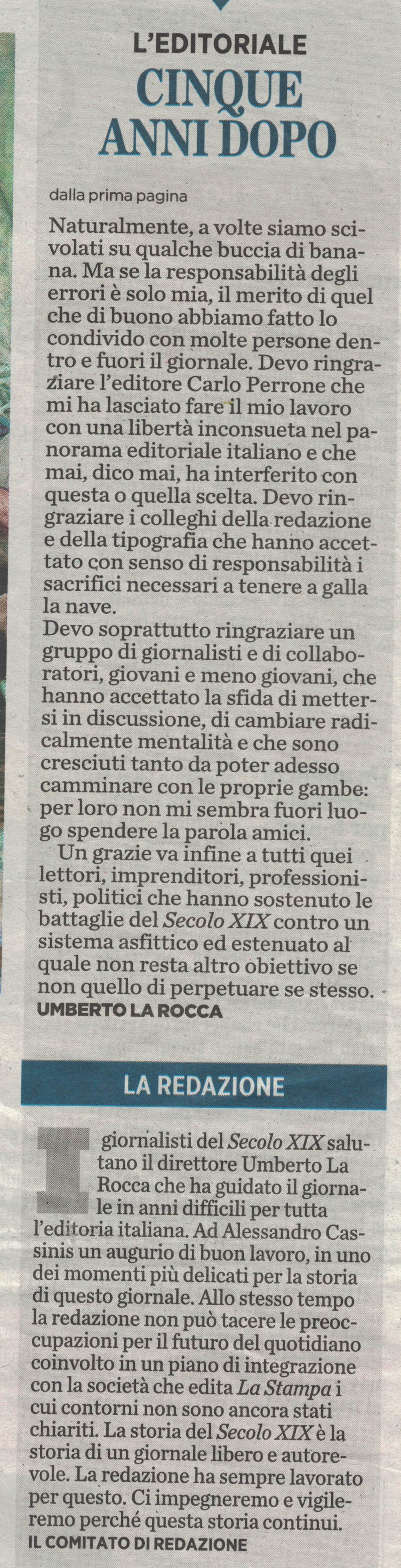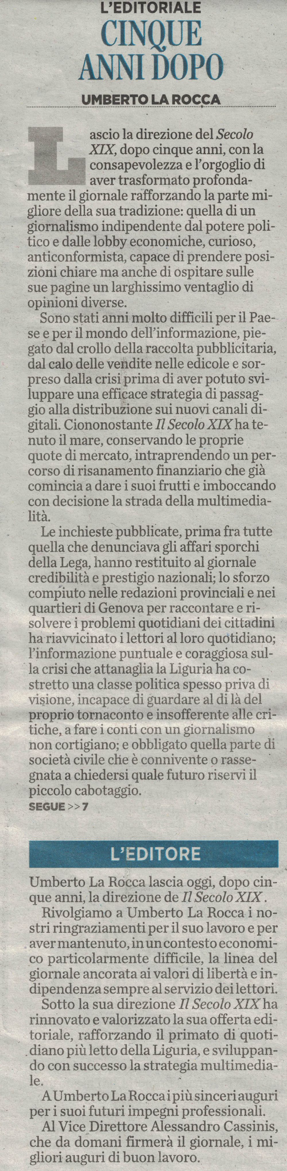 Umberto La Rocca ha lasciato Genova e il Secolo XIX nel 2014. Ora incomincia una nuova fase della sua brillante carriera, con un’iniziativa certamente impegnativa, ma che affronta con convinzione, determinazione e, forte sia delle sue capacità sia del valore del Corriere della Sera, con la volontà di vincerla.