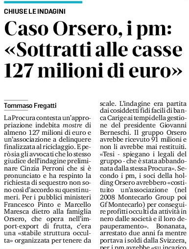 Due notizie contraddittorie tra sabato e domenica per l’industria leader nazionale nell’import di frutta e verdura: Orsero. La Repubblica, edizione ligure, titolava ‘I conti in nero degli Orsero, 16 indagati…’. Il Secolo XIX ricordava il ‘caso Orsero’: sottratti, tra il 2006 e 2016, 127 milioni’, di cui 91 a Carige. Il Gip ha tuttavia respinto la richiesta di sequestro di somme mentre il difensore sostiene che la truffa è ‘un’ipotesi fantasiosa’ e con il fisco si è proceduto al ‘ravvedimento operoso e dichiarazioni dei redditi integrativa’. Poi la bella notizia, invece, che l’azienda, con sede ad Albenga (gli eredi Orsero abitano a Pietra Ligure, come alcuni indagati), sta volando in borsa con il buon ‘carburante per shopping e investimenti’. L’obiettivo è superare, nel 2019, il miliardo di € di ricavi. E pensare che i più bastonati erano stati i dipendenti, molti rimasti senza lavoro. Ora clima di fiducia del mercato finanziario e investitori. Come non rallegrarsene per un’impresa ‘rinata’ e savonese dalle fondamenta.