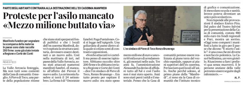 Brunengo: Credo sia opportuno premettere che è una scelta che parte nel 2022, dalla precedente Amministrazione, e perseguita dall’attuale. (sindaco Enrico Pira). Scelta non condivisa dalla minoranza di allora, della quale facevo parte, e tanto meno dalla maggioranza popolazione pievese. C’è stata una petizione con oltre 200 firme che chiedeva che il nuovo Asilo realizzato nella ex caserma Manfredi fosse mantenuto.
