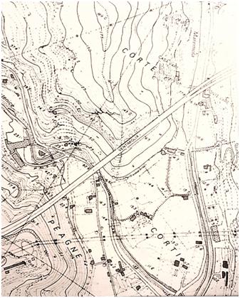 Significativa è la descrizione contenuta nella relativa scheda, che rende l’area in oggetto “ad alto rischio” archeologico, pag. 10, fig.1: “La zona è interessante per i risvolti toponomastici e per la vicinanza del sepolcro di Varè. Nell’area sono stati rinvenuti frammenti di tegoloni di epoca romana, oltre a monete del lll Sec. a.C. e di età imperiale; nel 1962, sono state, inoltre, rinvenute due tombe ad inumazione senza corredo. È, pertanto, probabile la localizzazione di un villaggio sviluppatosi in epoca romana, di cui il toponimo “Corti” testimonierebbe una sopravvivenza in età tardoantica o altomedievale“.