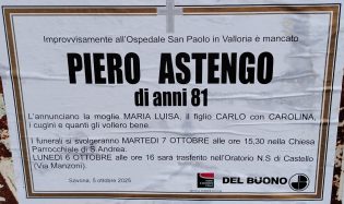 In queste ore Savona ha perso uno dei protagonisti della vita politica di questi ultimi 50 anni: è mancato a 81 anni appena compiuti (era nato a Sassello nell’agosto del 1944) Piero Astengo, “storico” consigliere comunale del PLI (era stato eletto per la prima volta nel 1970) poi assessore nella giunta guidata da Sergio Tortarolo e seguito esponente di Forza Italia anche candidato al Parlamento.