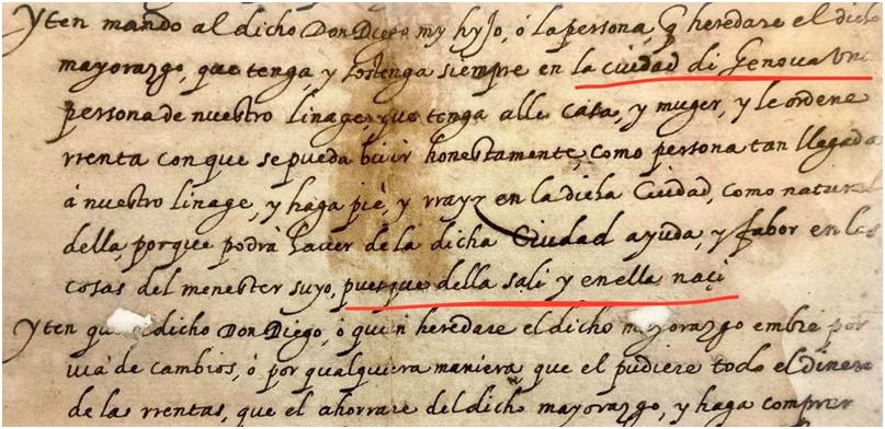 Il documento è anche una testimonianza del suo attaccamento a Genova, sua città natale, in quanto in esso incarica il figlio Diego di mantenere in essa una persona del loro lignaggio, con casa, famiglia e rendita adeguata, affinché abbia «piede e radice» nella città, fonte di aiuto e favore. Raccomanda inoltre di investire i risparmi nei titoli di San Giorgio, «denari sicuri» che rendono il 6%, con l’esortazione che i suoi eredi dovranno sempre agire «𝐩𝐞𝐫 𝐥‘𝐨𝐧𝐨𝐫𝐞, 𝐢𝐥 𝐛𝐞𝐧𝐞 𝐞