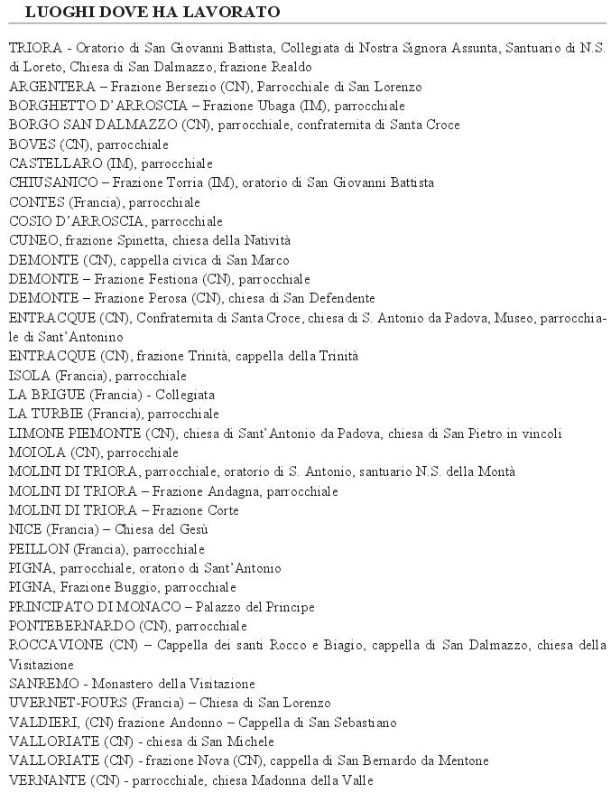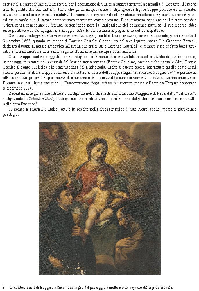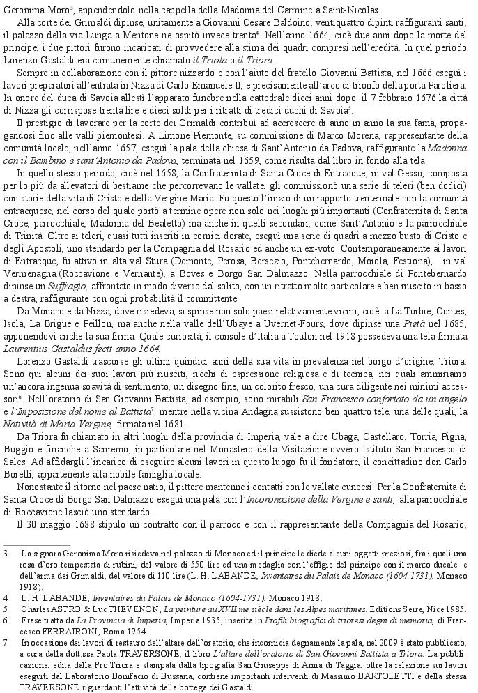 Battista è sempre vissuto nel paese natio. Giovanni Battista è morto giovane. Lorenzo invece si è distinto non solo per la quantità di opere ma anche per l’abilità nel periziare le esecuzioni di altri pittori, in particolare nel principato di Monaco, dove era comunemente chiamato il ‘Triola’ o il ‘Triora’. Nell’anniversario sarebbe stata un’occasione importante restaurare la ‘pala della chiesa parrocchiale’ o l’estasi di San Francesco.