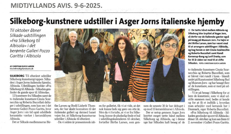 I primi a dare la notizia dell’iniziativa saranno i danesi, il 9 luglio 2025: “Gli artisti di Silkeborg espongono nella “città natale italiana di Asger Jorn”. Ad ottobre si inaugura la mostra “Da Silkeborg ad Albisola” presso la famosa Galleria Pozzo Garitta” titola il quotidiano di Silkeborg “Midtillands Avis”, in un articolo illustrato con una immagine, scattata presso il Museo Jorn, di Leif Draeby, presidente di “Silkaden”, Rand Kornerup-Bang, vice presidente, Roberta Buccellati, Cinzia Scarnecchia, in posa davanti ad un ampio pannello di quel grande artista, che motivava la propria ricerca nell’arte dicendo: “se non si va agli estremi, non c’è motivo di andare”.