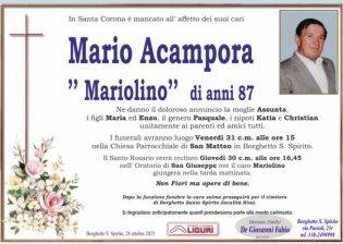 “Sono nato il 28 ottobre 1938 – esordisce Mariolino Acampora -, mio papà Vincenzo un tuttofare, mamma Maria casalinga, eravamo 6 figli. Quattro sono in vita, tre sorelle abitano a Borghetto: Elena, Carmela, Assunta. Siamo arrivati a Ceriale il 14 agosto 1952. Prima dimora nelle viette del centro storico. Qui sono rimasto 10 anni. Non posso dimenticare il sindaco (Parodi) che mi ha dato una mano a evitare la naia”.