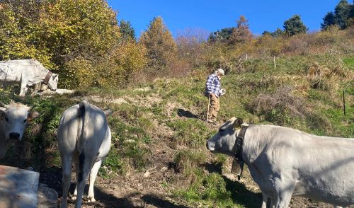 8/COSIO D’ARROSCIA – Il pastore al pascolo alla Madonna dei Cancelli. Ormai un veterano in alta Valle Arroscia. La solitudine non gli pesa. La passione non è venuta meno. La compagnia delle mucche rende meno monotone le sue giornate.