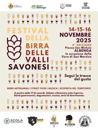 Festival della Birra delle Valli Savonesi approda ad Albenga per la 4ª edizione. 14 – 15 – 16 novembre 2025 | Piazza San Michele – Albenga