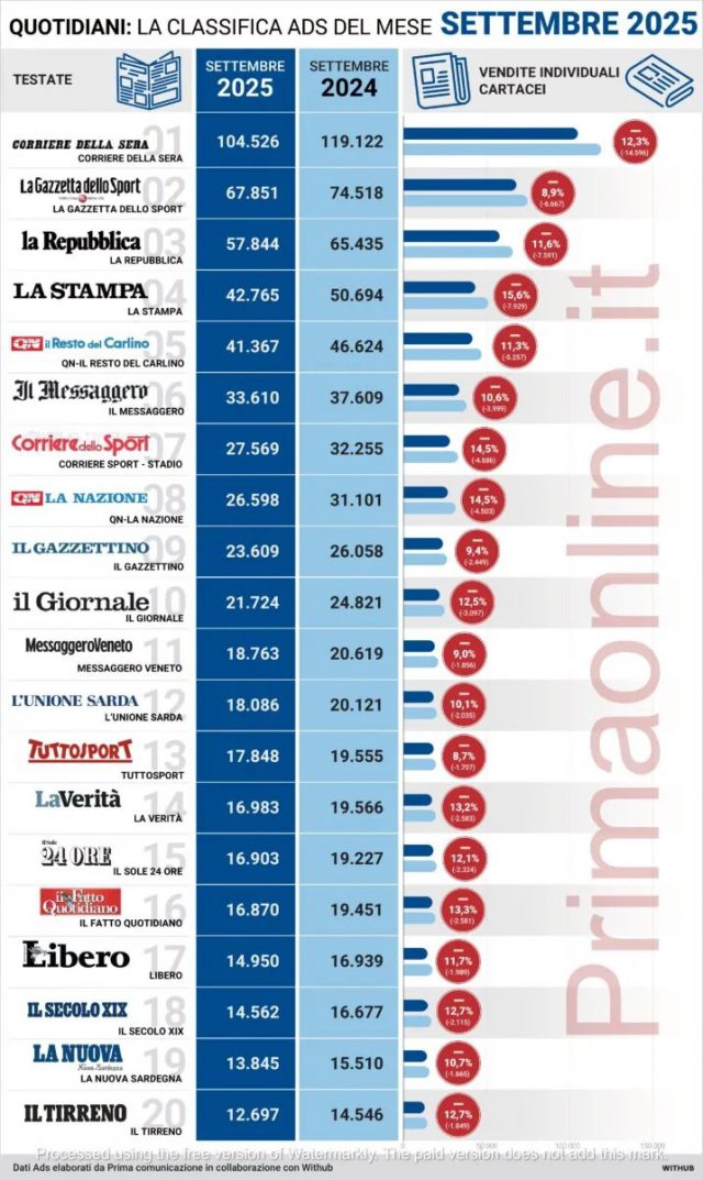 VENDITE IN EDICOLA DI QUOTIDIANI: a confronto settembre 2025 e 2024