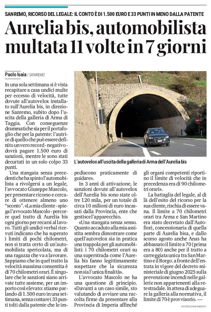 La Provincia di Imperia, presidente Claudio Scajola (FI) batte la provincia di Savona (Pierangelo Olivieri (FI) per le multe elevate sulle strade provinciali e rilevate da autovelox. Con un primato difficilmente raggiungibile. In 3 anni di attivazione sull’Aurelia bis, tra Arma e San Martino nell’imperiese sono stati incassati 10 milioni di €, come rivela Il Secolo XIX.