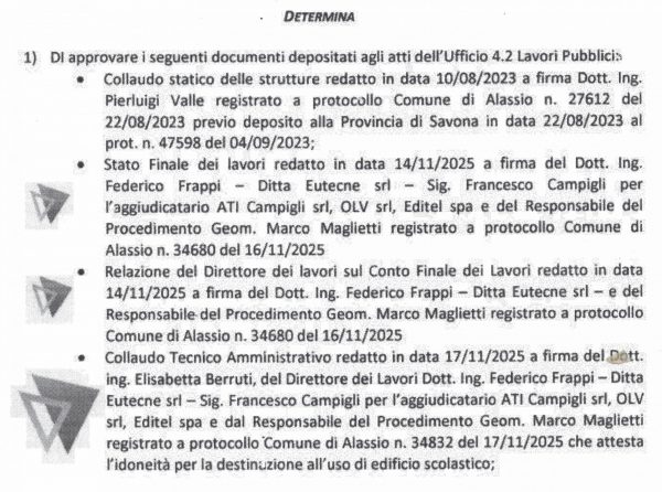 Collaudo Tecnico Amministrativo redatto in data 17/11/2025 a firma del Dott. ing. Elisabetta Berruti, del Direttore dei Lavori Dott. Ing. Federico Frappi – Ditta Eutecne srl – Sig. Francesco Campigli per l’aggiudicatario ATI Campigli srl, OLV srl, Editel spa e dal Responsabile del Procedimento Geom. Marco Maglietti che attesta l’idoneità per la destinazione all’uso di edificio scolastico.” (vedi determina…….)