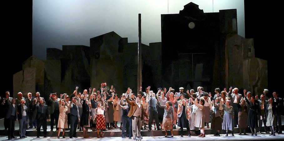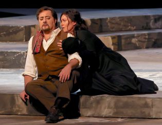 La regia di Teatrialchemici, alias Luigi Di Gangi e Ugo Giacomazzi, è tornata al Carlo Felice dopo il suo esordio nel 2019 con altro cast vocale. Una Sicilia archetipica, con sagome essenziali ad evocare le case e la chiesa, ed al centro un abbozzo – un semicerchio a due scalini – di antico teatro greco, come se le vicende di Turiddu e Santuzza fossero copioni di una tragedia eterna, affidata a personaggi più stereotipati che reali, in un tempo sospeso tra riti sacri e coreografie profane, e in ambienti dove le simbologie cristiane s’intridono di maschere pagane. In una rilettura di così denso simbolismo “steccava”, nella scena finale, l’irruzione di Alfio macchiato di sangue e col pugnale in mano. Un effettaccio che, a suo tempo, Giovanni Verga aveva stroncato in un allestimento in prosa di Cavalleria del discepolo Giovanni Grasso, tanto da fargli ritirare il copione. Non era il caso di riprovarci.