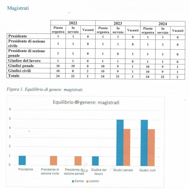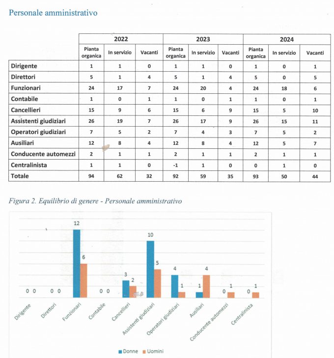 Sotto organico è anche il personale amministrativo: 4 unità mentre dovrebbero essere 7 (anche qui la pianta organica è all’ evidenza inadeguata e non è stata modificata nonostante l’aumento di competenze determinato dalla Riforma Cartabia).