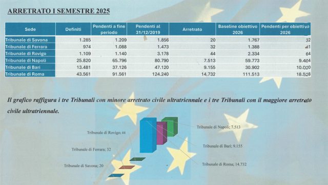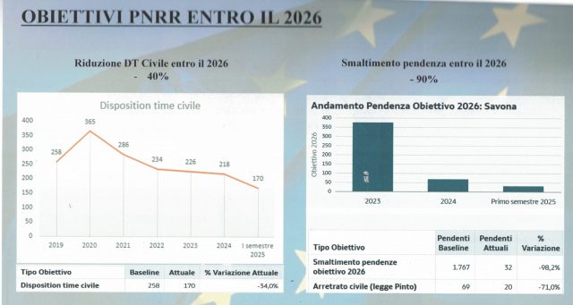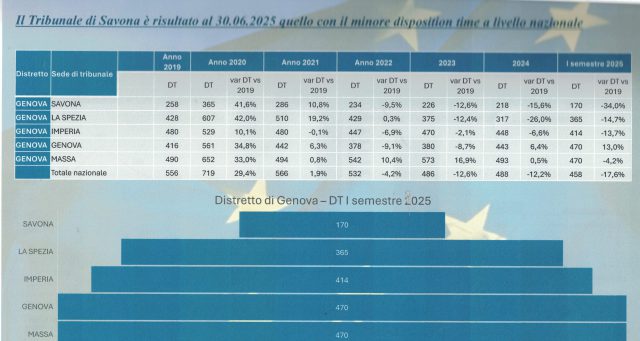 IL TRIBUNALE DI SAVONA AL 30 GIUGNO 2025 è QUELLA COL MINORE DISPOSITION TIME A LIVELLO NAZIONALE. “Disposition time” nella giustizia si riferisce alla durata media di un procedimento giudiziario ed è calcolato come rapporto tra i procedimenti pendenti e quelli definiti, moltiplicato per 365 giorni. Il suo abbassamento è un obiettivo chiave del PNRR, con target di riduzione del 40% nel settore civile e del 25% in quello penale entro giugno 2026 rispetto ai livelli del 2019, secondo il Ministero della giustizia.