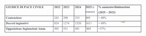 Tra gli aspetti significativi della riforma Cartabia permane l’incremento della competenza dell’ Ufficio del Giudice di Pace che dal marzo 2023 si occupa delle cause di valore sino a €. 10.000 (prima era 5000) e dei sinistri causati dalla circolazione di veicoli e natanti sino a €. 25.000 (prima 20.000). Come risulta dalla tabella che segue l’incremento riguarda anche le emissioni e le opposizioni di decreti ingiuntivi. I dati statistici evidenziano che l’ Ufficio del Giudice di Pace ha registrato un aumento di contenzioso del 40%, un aumento di emissione di decreti ingiuntivi del 49%