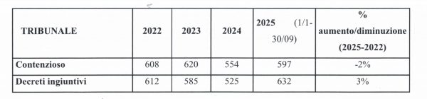Contemporaneamente il Tribunale ha verificato una diminuzione di contenzioso del 2% e un incremento di emissione dei decreti ingiuntivi del 3% rispetto all’ anno 2022