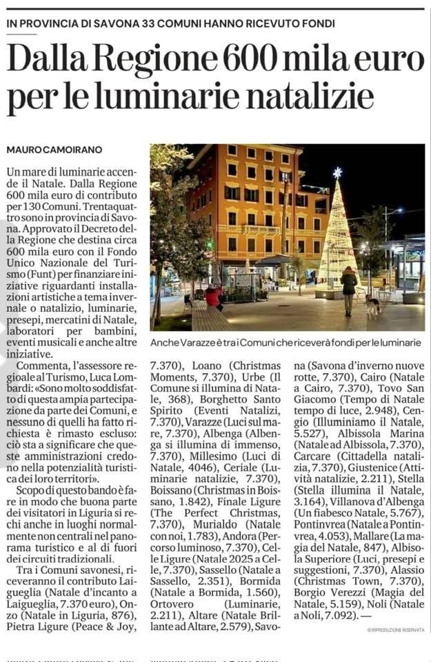 E’ stato approvato il Decreto di Regione Liguria che destina circa 600 mila euro con il Fondo Unico Nazionale del Turismo (FUNT) a 130 Comuni a seguito del bando per contributi agli eventi natalizi dal 1° dicembre 2025 al 31 gennaio 2026. Sono finanziate iniziative riguardanti installazioni artistiche a tema invernale o natalizio, luminarie, presepi tradizionali o contemporanei, mercatini di Natale, laboratori per bambini, eventi musicali nonché iniziative riguardanti il teatro, il cinema, la danza, la letteratura, la fotografia, la pittura, le visite guidate, le escursioni, le attività ludico-ricreative e didattiche, e gli approfondimenti sulla storia delle tipicità locali, fiere, sagre, esposizioni oppure il cimento invernale, percorsi storici o identitari di una comunità.