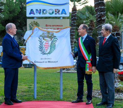 Al suo arrivo ad Andora il Principe Monegasco aveva scoperto il cartello stradale che sancisce appartenenza di Andora ai Siti Storici Grimaldi.