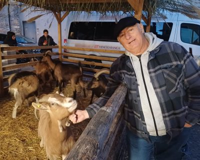 Aldo Lomanto e le sue caprette, presente al mercatino di fine settimana in piazza San Michele ad Albenga con il banchetto dei formaggi nostrani