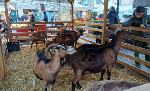 Le capre di Lomanto in piazza ad Albenga fanno attrazione per adulti e bambini . In realtà promuovono anche gli squisiti formaggi del pastore con oltre 1.100 pecore, capre e mucche