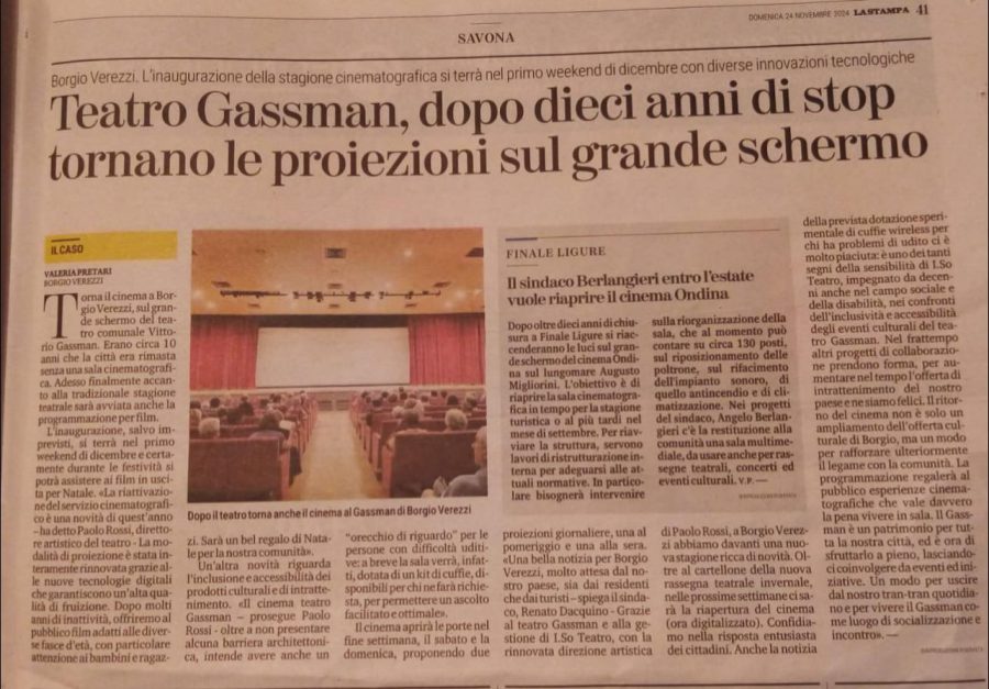 Venerdì 21 novembre 2025, in uno dei miei frequenti viaggi in Liguria, mi trovavo a Final Pia e ho accolto con piacere l’invito della testata a partecipare alla prima giornata del convegno, che si è svolta nella struttura polifunzionale del Cinema e Teatro Gassman di Borgio Verezzi, dedicato al “mattatore” dello spettacolo: un locale impegnato e teso alla ricerca e alla sperimentazione, che opera in collaborazione con il Festival e accoglie parte delle opere e manifestazioni che caratterizzano l’intensa attività culturale del piccolo Comune rivierasco.