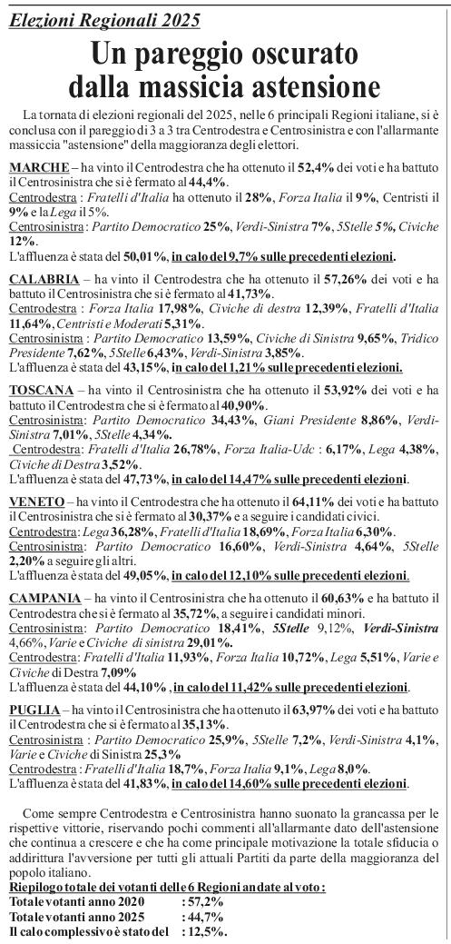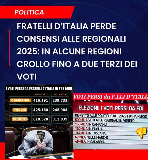𝗙𝗿𝗮𝘁𝗲𝗹𝗹𝗶 𝗱’𝗜𝘁𝗮𝗹𝗶𝗮 𝗽𝗲𝗿𝗱𝗲 𝗰𝗼𝗻𝘀𝗲𝗻𝘀𝗶 𝗮𝗹𝗹𝗲 𝗥𝗲𝗴𝗶𝗼𝗻𝗮𝗹𝗶 𝟮𝟬𝟮𝟱: 𝗶𝗻 𝗮𝗹𝗰𝘂𝗻𝗲 𝗿𝗲𝗴𝗶𝗼𝗻𝗶 𝗰𝗿𝗼𝗹𝗹𝗼 𝗳𝗶𝗻𝗼 𝗮 𝗱𝘂𝗲 𝘁𝗲𝗿𝘇𝗶 𝗱𝗲𝗶 𝘃𝗼𝘁𝗶.