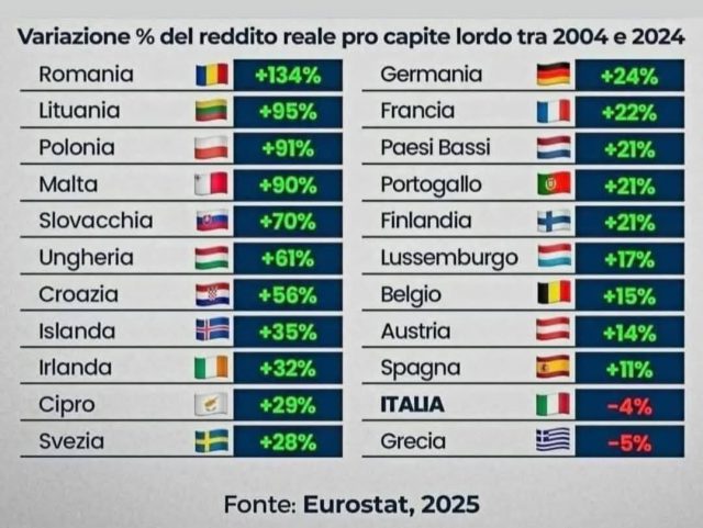 Spettabile Trucioli, un sito assai popolare in Valle Arroscia ha pubblicato una tabella sulla variazione % del reddito reale pro capite lordo tra il 2004 e 2024 degli italiani. La fonte è Eurostat (‘ufficio statistico dell’Unione Europea). Il governo Meloni ripete, ascoltando le due maggiori aziende televise (Rai e Tv degli eredi Berlusconi), che i conti del Paese godono ottima salute e mai l’Italia ha avuto una crescita e un benessere così importanti e mai così tanti occupati.