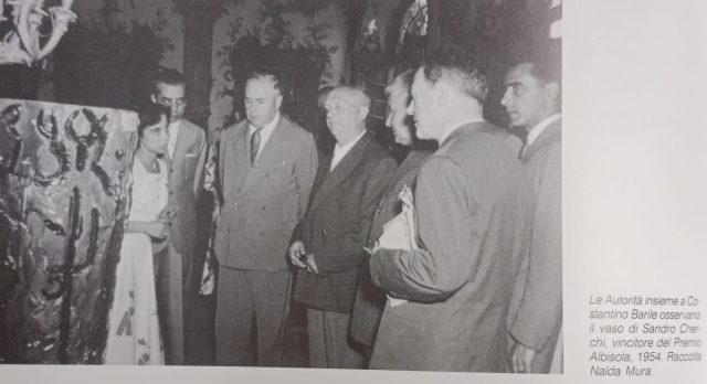 Dal 24 luglio al 24 agosto 1954 Albisola Superiore, Albissola Marina e Savona sono sedi del “Premio Nazionale Albisola per la Ceramica 1954”, promosso dalla “Azienda Autonoma di Soggiorno delle Albisole” presieduta da Costantino Barile. E’ uno dei primi eventi ceramici di respiro nazionale del secondo dopoguerra, con sezioni dedicate, rispettivamente, a vasi, statue, pannelli (pensando all’arredo urbano o di ambiente), opere di Istituti e Scuole d’arte, (per la promozione di giovani ceramisti): 160 opere, 63 delle quali da nove Istituti d’arte da varie regioni.