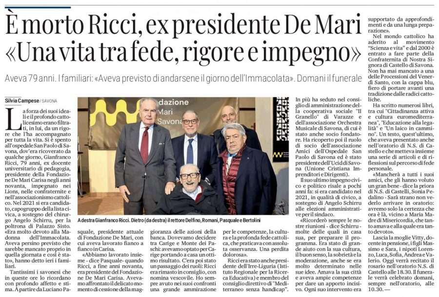 Abbiamo scritto il 29 luglio 2021 su Trucioli.it: “Elezioni comunali a Savona. Se il dr. Schirru si presenta candidato sindaco con il ‘volto pulito del massone’, non meno interessante e significativa la presenza di un savonese ancora più popolare e quasi enigmatico, sulla scia di una profonda cultura, quale il prof. Gianfranco Ricci. Co-protagonista nella travagliatissima e ingloriosa storia della Carisa. Ricci, più che un attore, è apparso un ‘mediatore’ tra chi menava fendenti, tra chi era schierato (la sinistra) con il contendente Monte dei Paschi e chi stendeva tappeti alla Carige. E che sorte finale?! Ricci un moderato, liberal democratico, riflessivo, catapultato in uno dei momenti più drammatici che finiranno per segnare la storia della gloriosa Cassa di Risparmio di Savona. Ricci, per testimonianza, aveva l’attitudine alla trasparenza nel confrontarsi con il giornalista che gli poneva domande. Non ‘fuggiva’ seppure parco di parole e guardingo. Non usava allocuzioni. Sia quando da presidente della Fondazione de Mari (‘fortino e feudo’ del dott. Luciano Pasquale), sia quando si accennava all’Opus Dei (Opera di Dio), di cui era storico membro.