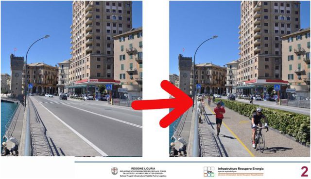 Una città come Savona può realizzare una pochezza di questo tipo? I nostri politici hanno mai visto la passeggiata di Noli? E qui mi fermo! Quando scorre sull’Aurelia è piccola, stretta, piena di ostacoli (pali, bidoni,scivoli,…) non protetta a sufficienza, piena di spigoli, ospita anche …. parcheggi camion, ……Una grande attrazione turistica per la Savona del domani!