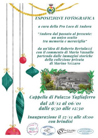 Vassallo, ideatore e curatore del sito Andora nel tempo, racconteranno i luoghi e situazioni di un tempo. La mostra sarà aperta, nella Cappella di Palazzo Tagliaferro, dal 28 dicembre al 6 gennaio, con orario di apertura dalle 9:30 alle 12:30.