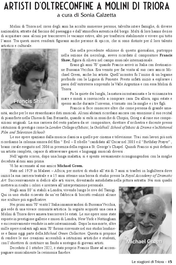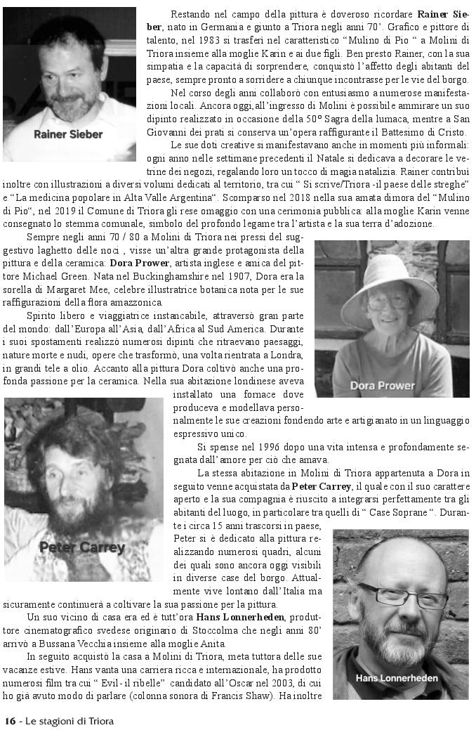 ‘Le stagioni Triora’, prestigioso periodico che fa onore alla comunità della Valle Argentina e a quanti contribuiscono a tenere in vita il giornale, ha pubblicato un articolo sui ‘cittadini onorari’ del mondo dell’arte che hanno scelto di stabilirsi a Molini di Triora. Alcuni non sono più invita. Artisti con una nomea internazionale e con un legame profondo con la natura incontaminata della valle e dei suoi monti.