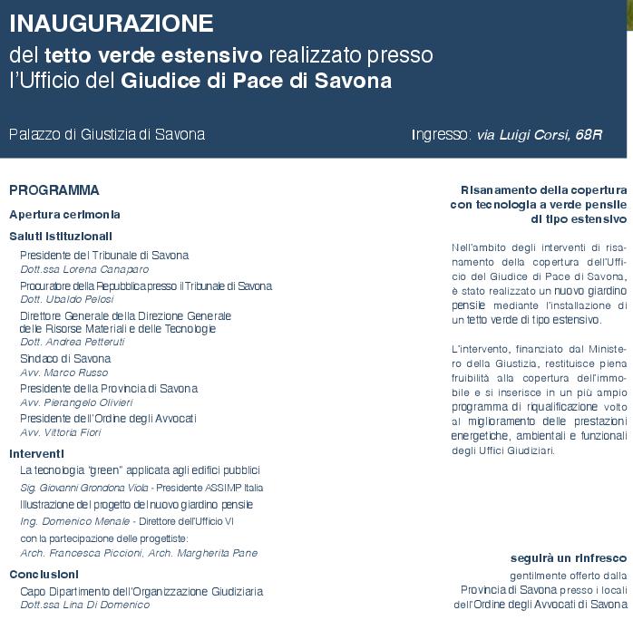 In rappresentanza della Provincia di Savona e su invito del Presidente del Tribunale di Savona, Dottoressa Lorena Canaparo, oggi ho partecipato alla Cerimonia di inaugurazione del risanamento della copertura mediante tecnologia a verde pensile di tipo estensivo, realizzato presso l’Ufficio del Giudice di Pace di Savona.