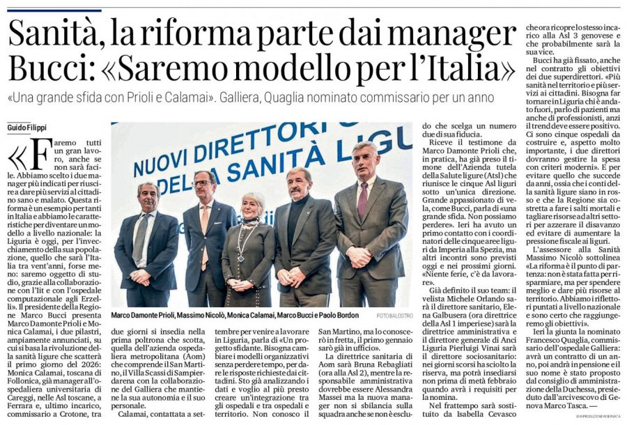 AREE SOCIOSANITARIE LIGURI, NOMINATI I DIRETTORI- Al centro del nuovo modello di governance, si configura la nascita dell’Azienda Tutela Salute Liguria, che coordinerà l’assistenza territoriale articolata in cinque aree, oltre all’area Liguria Salute. Nasce anche il nuovo IRCSS Azienda Ospedaliera Metropolitana di Genova, che integrerà il Policlinico San Martino, il Galliera e l’ospedale Villa Scassi, per rafforzare l’alta specializzazione, ottimizzare l’attività chirurgica e ridurre le liste d’attesa. È stata inoltre raggiunta intensa con Monsignor Marco Tasca per la direzione dell’ospedale Galliera, che rientrerà nell’IRCSS Azienda Ospedaliera Metropolitana di Genova.