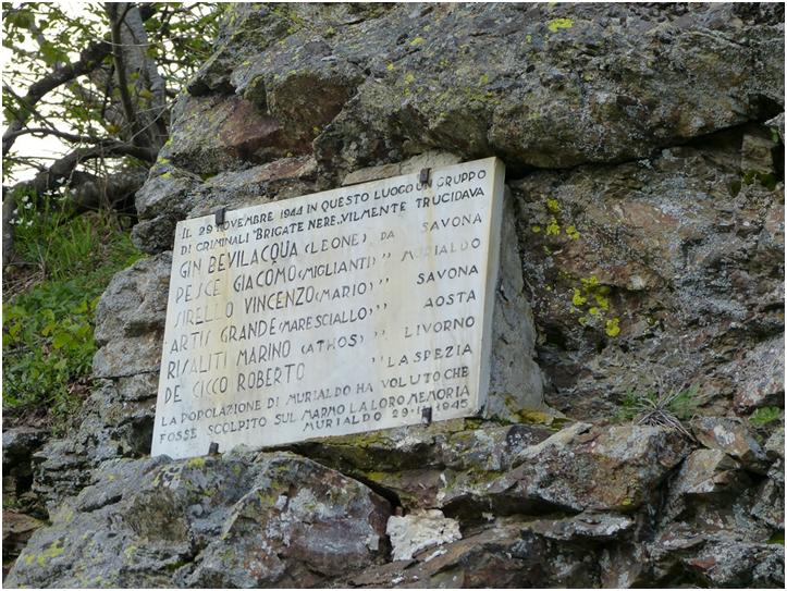 Monte Camulera. Il sito dell’eccidio di 6 Partigiani, catturati e ferocemente passati per le armi il 29 novembre 1944, dalle forze repubblichine, ubicato poco sotto la vetta del Monte Camulera. Proprio qui verrebbe realizzato lo svincolo della strada di progetto per poter realizzare un ramo laterale fino al sito della prima delle turbine (SV9_01) sul Bric Finarin.