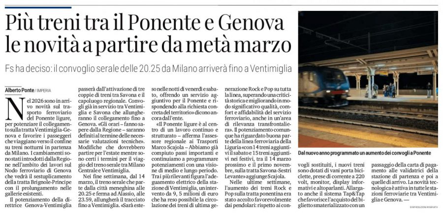 Resta anche irrisolto il problema del rientro serale da Genova per i lavoratori: il treno 3380 da Brignole (ore 17:35) a Ventimiglia (20:03) è sempre strapieno almeno fino a Savona. Visto che con i nuovi materiali il numero di posti è fisso, occorrerebbe un ulteriore servizio in quella fascia oraria.