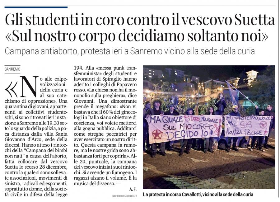 L’iniziativa è nata in risposta alla notizia, diffusa il 30 dicembre scorso dalla diocesi di Sanremo, dell’installazione della campana dedicata ai bambini non nati, fatta suonare quotidianamente. Una scelta che ha suscitato indignazione anche tra le vittime di abusi sessuali commessi in età infantile da esponenti del clero. “La Chiesa cattolica – hanno spiegato gli organizzatori – continua a tuonare contro un diritto e a voler gestire il corpo delle donne, ma costruisce muri di silenzio quando si tratta di affrontare concretamente gli orrori della pedofilia praticata dai propri ufficiali”.