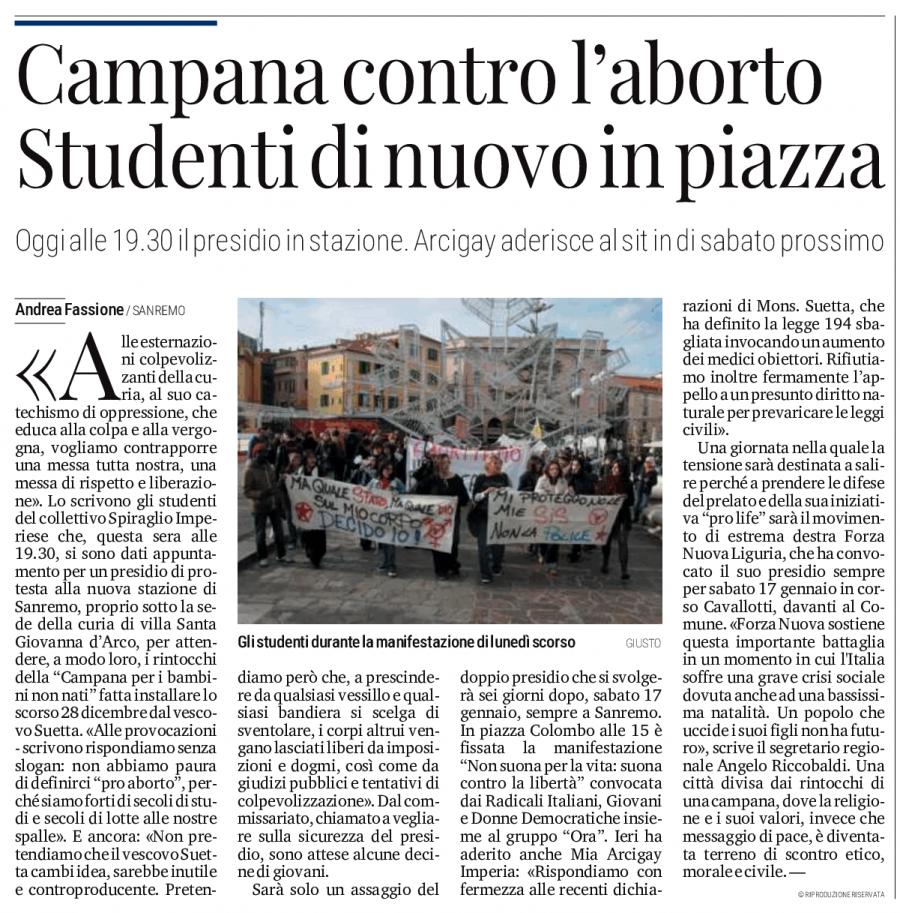 Non si placano reazioni e polemiche all’iniziativa del vescovo di Sanremo-Ventimiglia di far suonare ogni sera, alle 20, la “Campana dei Bambini Non Nati”. Inaugurata nella torretta di Villa Giovanna d’Arco, sede della Diocesi, suona  per celebrare i feti abortiti, impropriamente e definiti “bambini non nati”. L’Alleanza Cattolica e Centro Studio Rosario Livatino promuovono un incontro on line con mons. Suetta. Tema: ‘Riflessione su in’iniziativa che fa discutere’. Anche Forza Nuova Liguria, dopo l’UDC, scendo in campo a difesa del prelato.