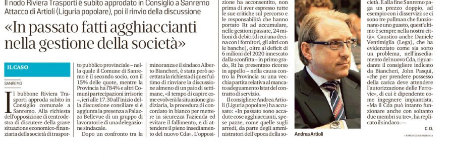 1/Il titolo de La Stampa del 10 dicembre 2025- Riviera Trasporti, ecco le colpe dei dirigenti secondo la Corte dei Conti- Bus a idrogeno: la Corte attribuisce agli amministratori quattro diverse gravi responsabilità. Dagli accordi svantaggiosi al depauperamento patrimoniale fino all’uso deficitario dei mezzi e “al caso” Carige. di MATTIA MANGRAVITI……