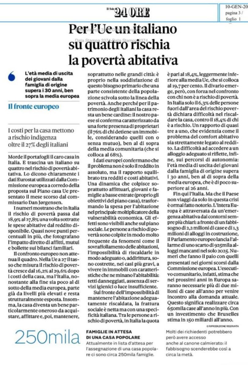 L’aspetto più allarmante è che se negli anni ’70-’80-’90 sul mercato si poteva trovare abitazione per famiglie- ovvero almeno trilocali- oggi si punta tutto al bilocale. In pratica si sono chiuse le porte ai nuclei famigliari. La speculazione immobiliare è più forte di prima, ma almeno in passato era un argomento che teneva banco tra le forze politiche, nella società, nei programmi elettorali. Figurava tra le priorità di un sindaco, di un parlamentare, oggi viene ignorato. Per chi fa politica la corsa è l’apparire, annunciare, darsi merito di questa o quella opera pubblica, del finanziamento, del progetto come se si trattasse di un fatto personale. E’ la decadenza di una classe politica che non conosce limiti e pare non se ne renda conto. O meglio siamo al governo dei mediocri. I senza casa possono aspettare.