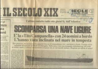 COMUNICATO STAMPA – Il 14 gennaio 1984 affondava e scompariva in maniera misteriosa e irrisolta (non vennero recuperati né i rottami del mercantile, né i corpi dei 24 componenti dell’equipaggio, con l’allarme che venne colpevolmente diffuso solo otto giorni dopo il naufragio) nel Golfo di Biscaglia la nave mercantile Tito Campanella, portando con sé le vite di 24 marittimi italiani (siciliani, sardi, pugliesi, campani e toscani), nove dei quali liguri tra cui tre genovesi, tre spezzini e tre savonesi; il radio telegrafista Pier Giovanni Dorati 50 anni, di Albissola Marina, il primo macchinista Antonio Gaggero, 59 anni, di Celle Ligure e il giovane di macchina Marco Incorvaia, 22 anni, di Savona.