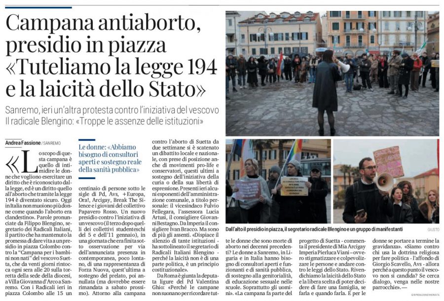 Il giornale La Provincia Unica a firma del direttore Diego Minonzio, scrive in un lungo articolo a sostegno del vescovo: “Una delle polemiche più comiche di inizio anno ha coinvolto il vescovo di Sanremo, Antonio Suetta, che dal 28 dicembre scorso ha deciso di far suonare ogni sera alle venti alcuni tocchi di campana dedicati “ai bimbi non nati”. Con questa iniziativa intende ricordare per pochi secondi al giorno i 65mila feti abortiti ogni anno nel nostro paese, come simbolo di una doppia tragedia silenziosa che avviene quotidianamente e che coinvolge due vittime: la madre e il figlio. Apriti cielo. Dopo mezzo minuto è partita la più classica delle indignate e indignanti indignazioni del meglio mondo sedicente progressista della Regione Liguria e dell’Italia “superiore”, che pensa di trovarsi ancora in una seduta di autocoscienza degli anni Settanta. E vergogna e infami e mascalzoni e intollerabile attentato alla Costituzione e inaccettabile vulnus all’eredità della lotta partigiana e inqualificabile sfregio alla libertà delle donne e il corpo è mio e me lo gestisco io e dagli ai clerico-fascisti e dagli al patriarcato e dagli all’autoritarismo che vuole tutte donne Cenerentole e giù le mani dalla sacralità della 194 e bla bla bla”.